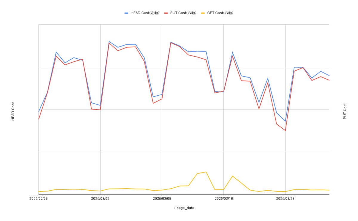 CURを利用して取得した2025年2月-3月のHeadObjectとPutObject、そしてGetObjectのグラフは以下のようになります。